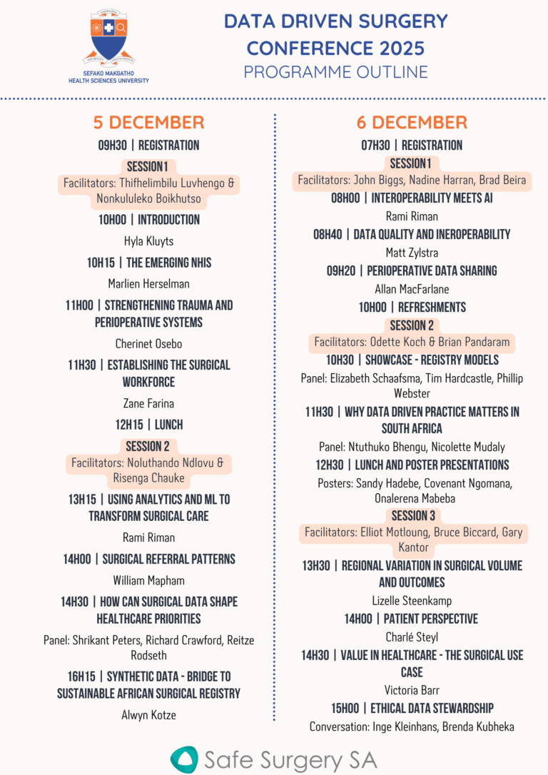 On Wednesday the 4th of December 2024, a conference on Data Driven Surgery: Empowering Policy & Practice, was co-hosted by Sefako Makgatho Health Sciences University (SMU) and Safe Surgery SA. The programme included impactful presentations by high-profile South African and Namibian colleagues, and insightful discussions guided by illustrious panellists. Find the programme here.